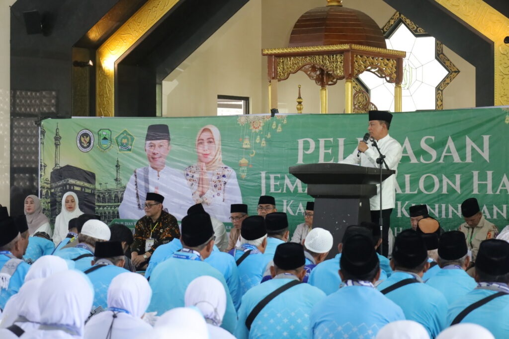 TERASJABAR.ID – Jemaah Calon Haji (JCH) Kab. Kuningan Kloter 8 sebanyak 445 orang, untuk musim haji 1447 Hijriah/2026 Masehi dilepas Bupati Kuningan, Dian Rachmat Yanuar, di Masjid At-Taufiq Kuningan Islamic Center (KIC). Mereka diantar ribuan keluarga JCH, Minggu (26/4/2026).