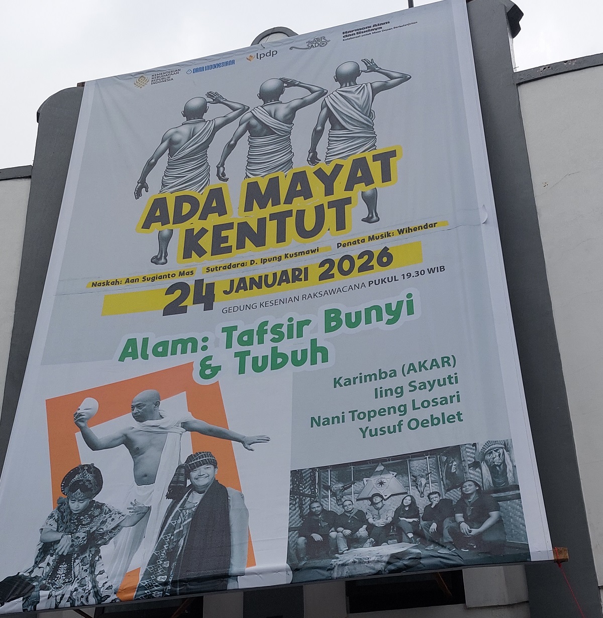 Bagi publik yang penasaran “Ada Mayat Kentut” silahkan datang ke Gedung Kesenian Raksawacana Jl. Veteran 52 Kuningan Sabtu (24/01) pukul 19.30 – 21.39 WIB.