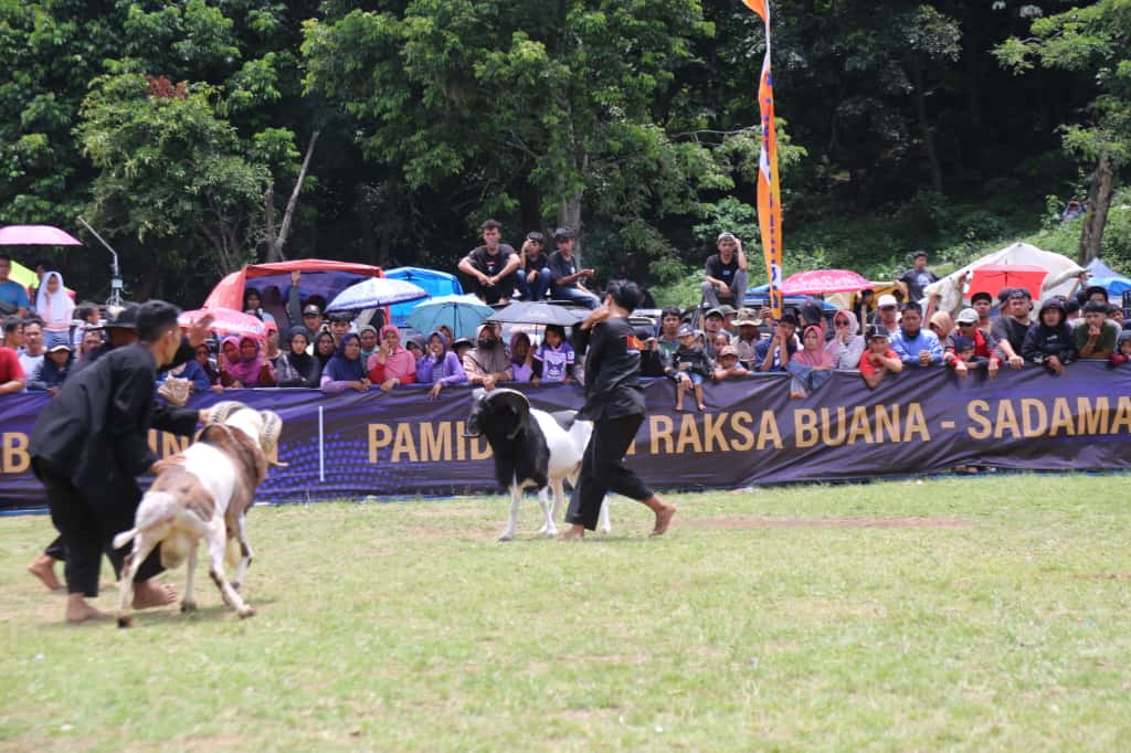 Tetabuhan seni tradisional dan riuhnya sorak sorai penonton yang memadati lapang Pamidangan Raksabuana, menambah semarak suasana perhelatan Adu Domba atau Seni Ketangkasan Domba Garut.
