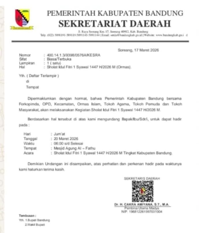 Isi suratnya, dipermaklumkan dengan hormat, bahwa Pemkab Bandung bersama Forkopimda, OPD, kecamatan, ormas Islam, tokoh masyarakat dan tokoh agama akan melaksanakan salat Idulfitri 1 Syawal 1447 H/2026. Pelaksanaan salat Idulfitri tingkat kabupaten Bandung, hari Jumat (20/3/2026) pukul 08.00 hingga selesai, tempat Masjid Agung Al Fathu Soreang. Undangan dengan logo Pemkab Bandung itu ditandatangani Sekda Kab. Bandung, Cakra Amiyana.