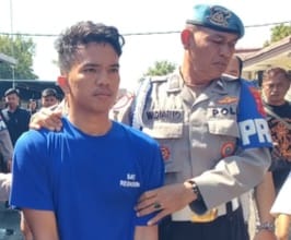 Saat konferensi pers di Mapolres Indramayu, Selasa (26/8/2025), Bripda Alvian dihadirkan dengan mengenakan baju tahanan berwarna biru dan tangan terborgol ketika polisi mengungkap kronologi penangkapan dan barang bukti yang disita.