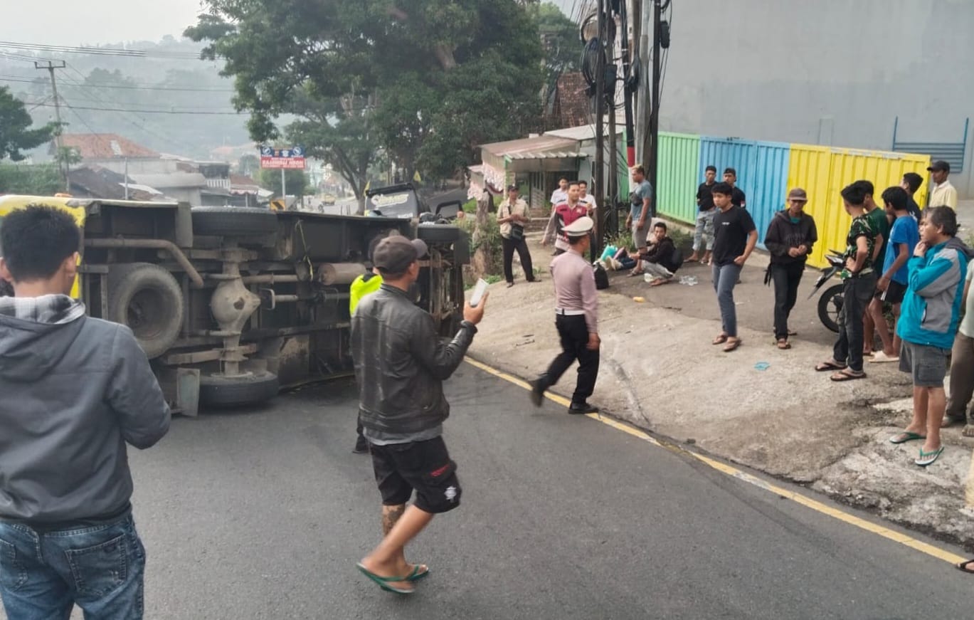 TERASJABAR.ID – Sebuah angkutan umum (angkum) jenis elf terguling di turunan sekitar Jalan Cagak Nagreg, Kabupaten Bandung, Senin (21/10/2025) sore.