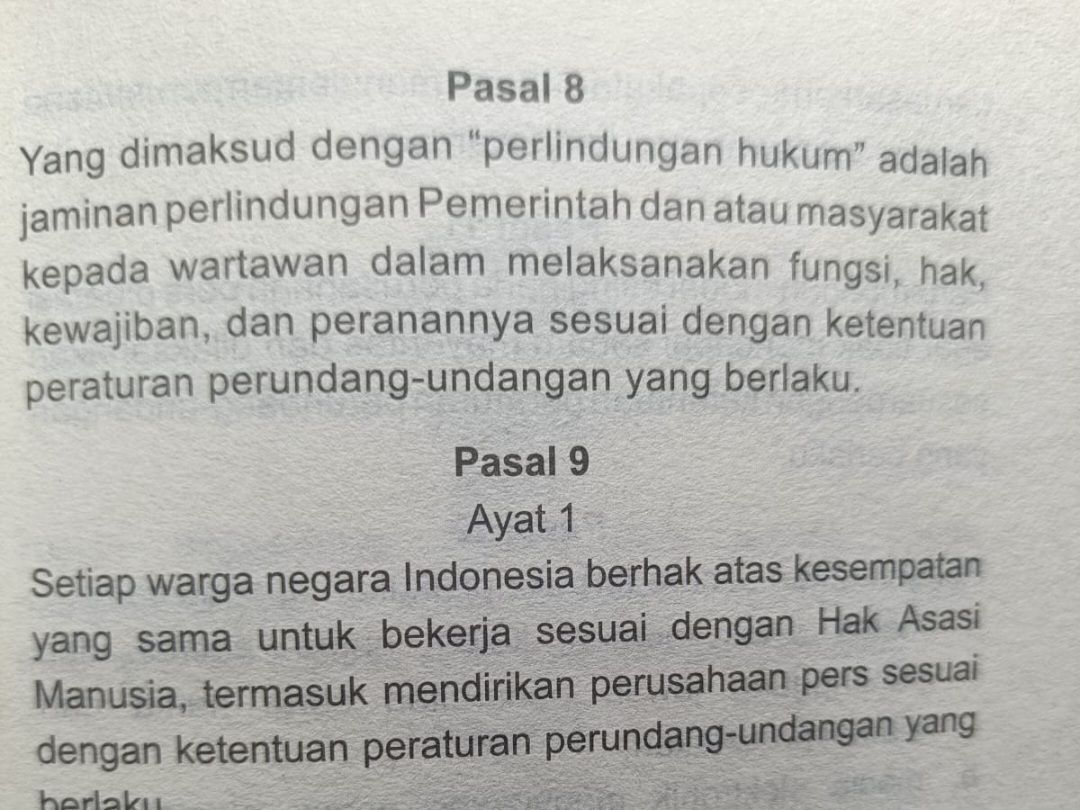 Pasal 8 menyebutkan: “Dalam melaksanakan profesinya wartawan mendapat perlindungan hukum.” Namun Koordinator Nasional FWK Raja Parlindungan Pane mempertanyakan efektivitasnya.