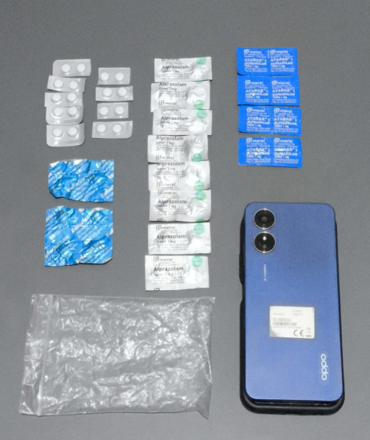 Barang bukti yang berhasil disita dari pelaku di yakni 18 (delapan belas) butir obat psikotropika jenis MERSI RIKLONA 2 mg, 16 (enam belas) butir obat psikotropika diduga jenis MERSI ALPRAZOLAM 1 mg, 8 (delapan) butir obat psikotropika diduga jenis MERSI ATARAX 1 mg, 6 (enam) butir obat psikotropika diduga jenis EUFORIS CLONAZEPAM 2 mg dan 1 buah HP.
