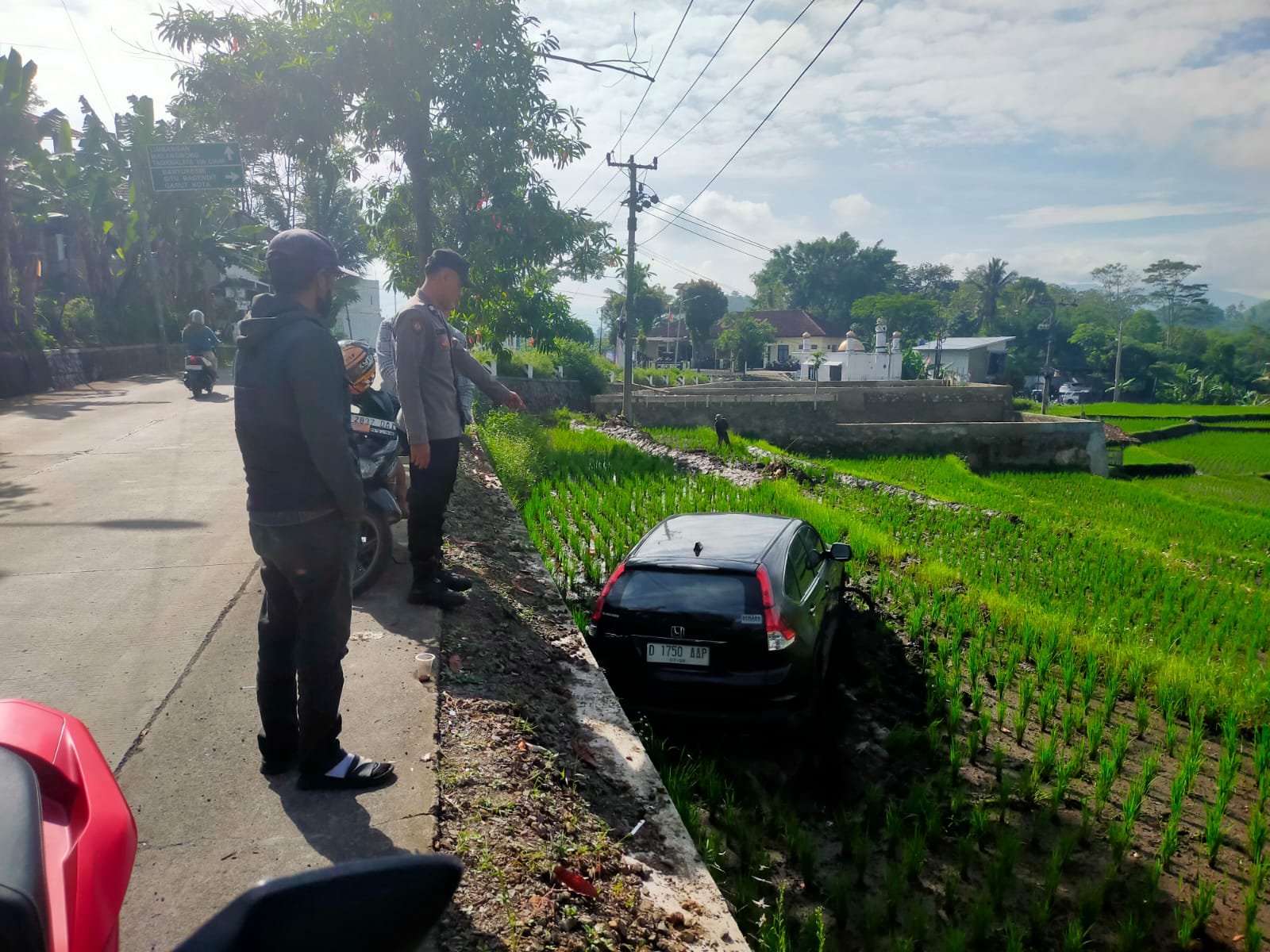 TERASJABAR.ID – Satu Mobil Honda CR-V nomor polisi D 1750 AAP warna hitam yang dikemudikan Yusuf Permana (62), warga Bandung, mengalami kecelakaan di jalan Raya Leuwigoong Pasopati, Kab. Garut, Sabtu(22/11/2025). Yusuf mengatakan, hendak menuju Kec. Banyuresmi dari Leles Leles. Saat berada di TKP, mobil yang ia kemudikan hilang kendali dan loncat ke sawah.