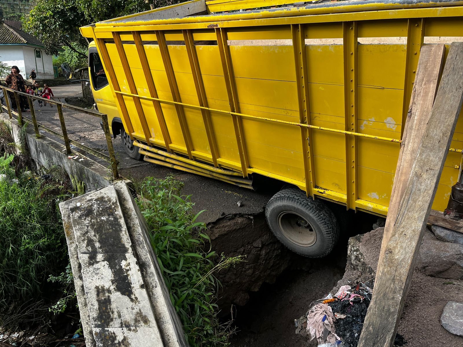 Jembatan yang putus ini juga menyebabkan satu unit truk pengangkut pasir dengan nomor polisi Z 8952 FZ terperosok di area jembatan yang mengalami kerusakan.