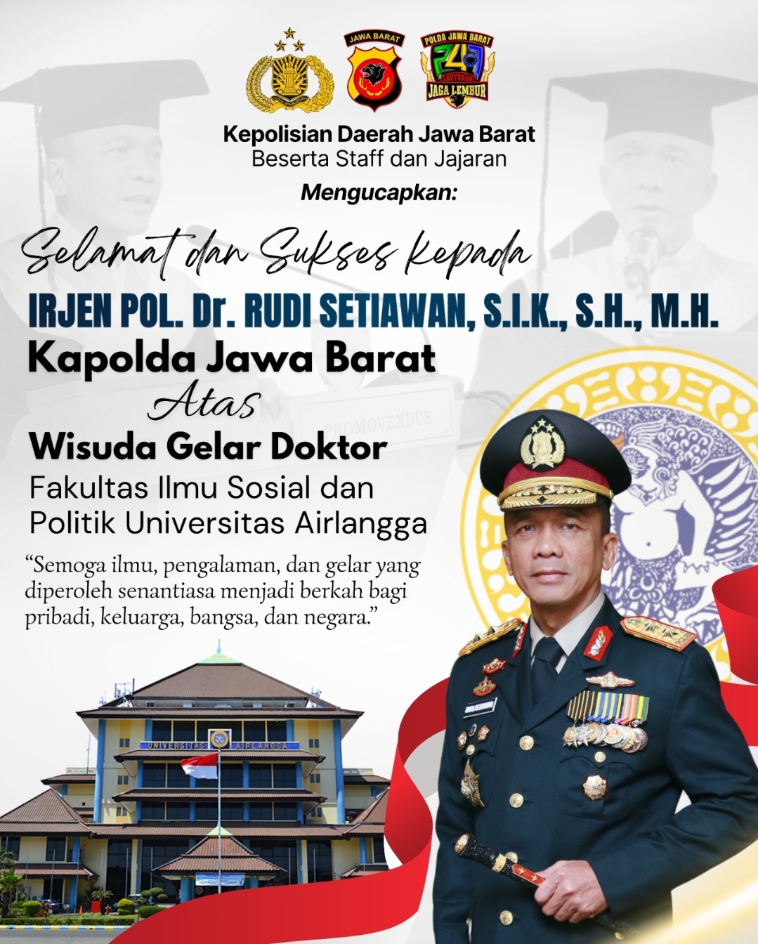 Polda Jabar juga menyampaikan doa agar ilmu, pengalaman, dan gelar yang diraih Kapolda dapat membawa keberkahan serta memberikan kontribusi positif bagi institusi kepolisian dan masyarakat luas.