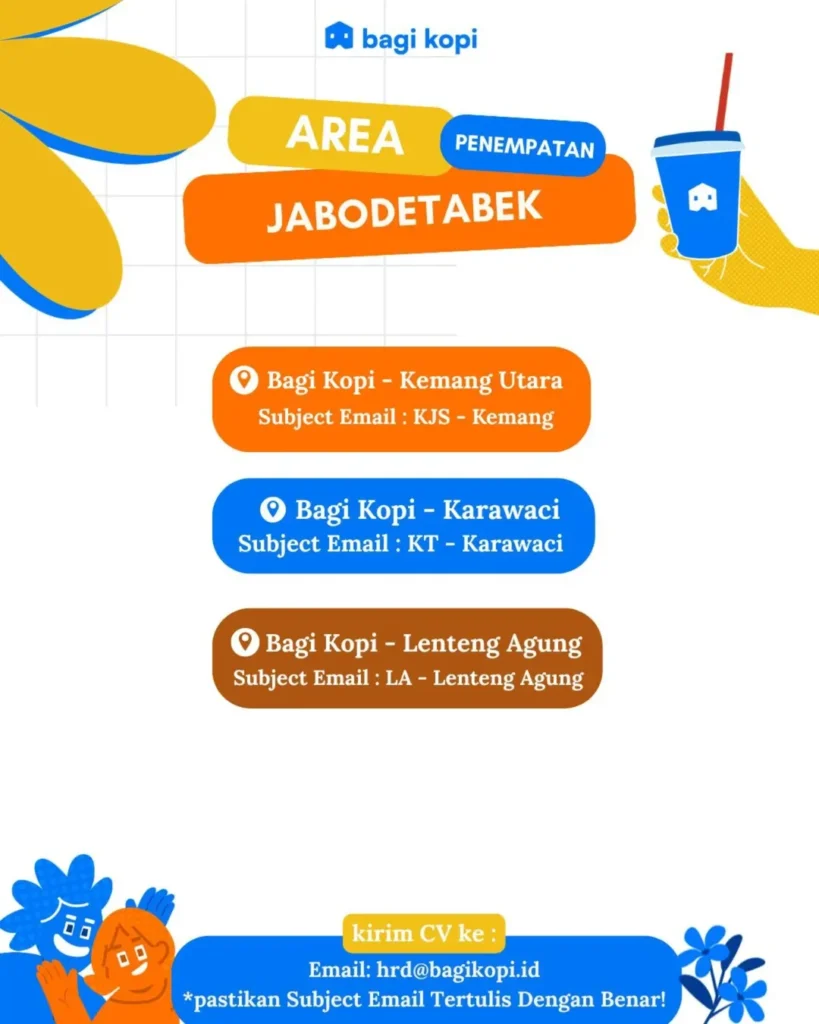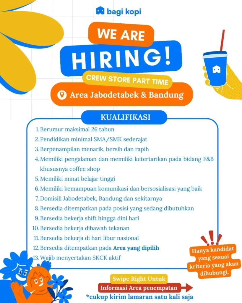 Dengan posisi sebagai Crew Store Part Time, loker Bagi Kopi Bandung dan Jabodetabek menjadi peluang emas bagi lulusan SMA/SMK.