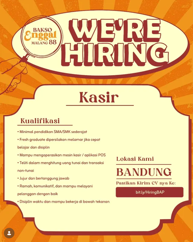 Dengan posisi sebagai Kasir, bagi Anda yang memiliki pengalaman terkait, loker Bakso Enggal Malang 88 Bandung menjadi kesempatan emas.