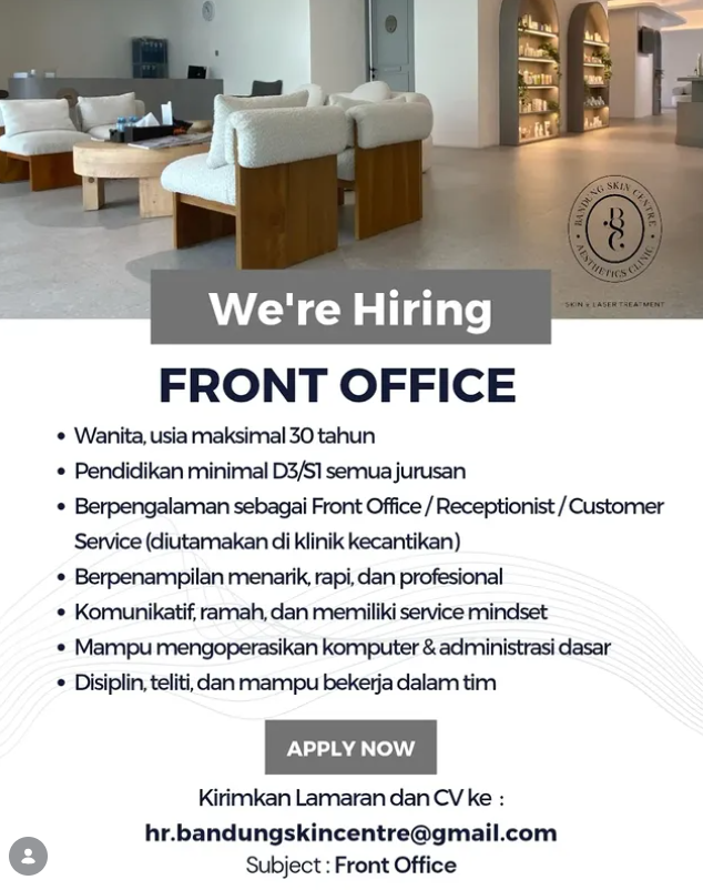Dengan posisi sebagai Front Office, loker Bandung Skin Centre menjadi peluang emas yang harus dimanfaatkan.