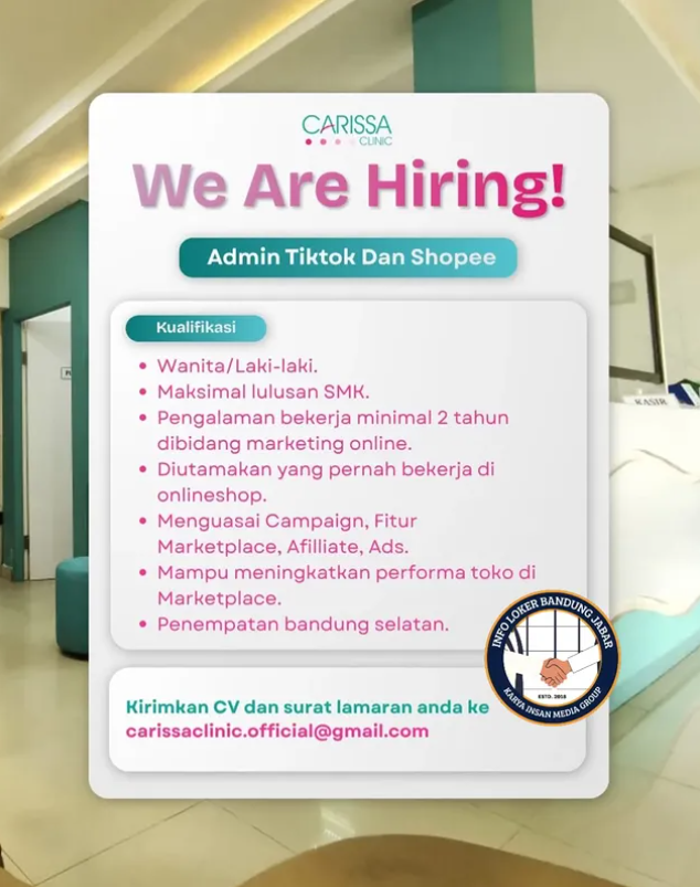 Sekarang, Carissa Clinic Bandung sedang menggelar lowongan kerja (loker) yang terbuka bagi tamatan SMK.