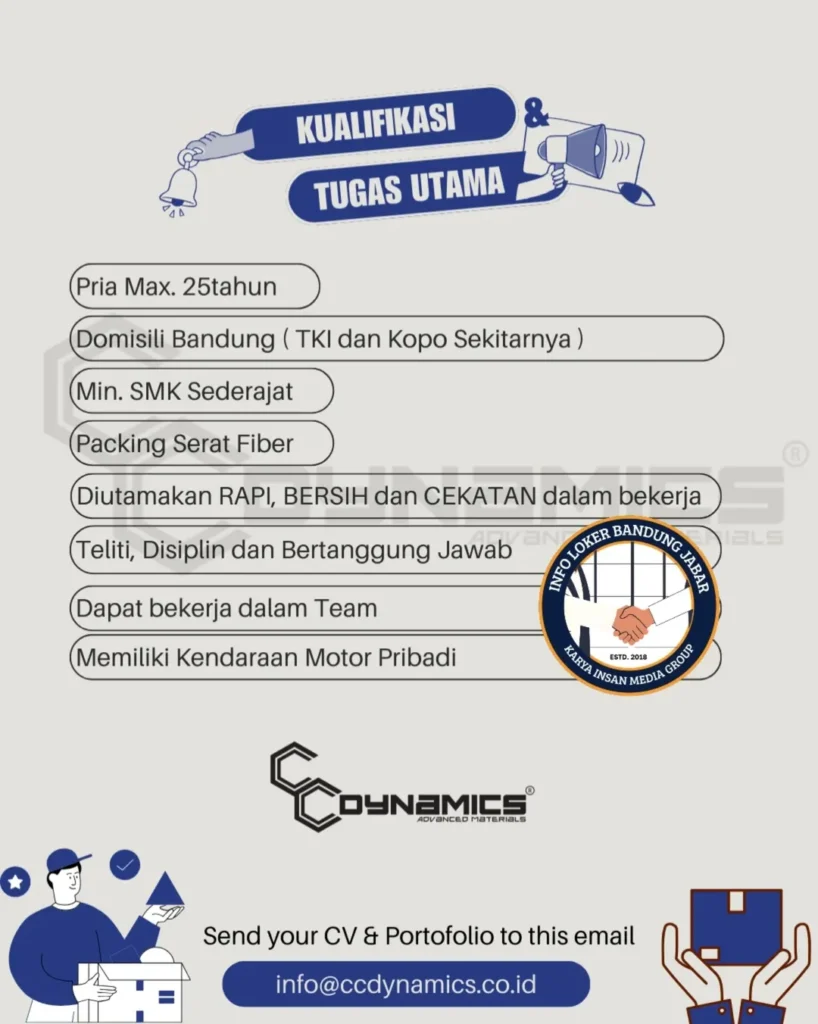 Sekarang, CC Dynamics Bandung sedang membuka lowongan kerja (loker) yang terbuka sebagai Staff Packing.