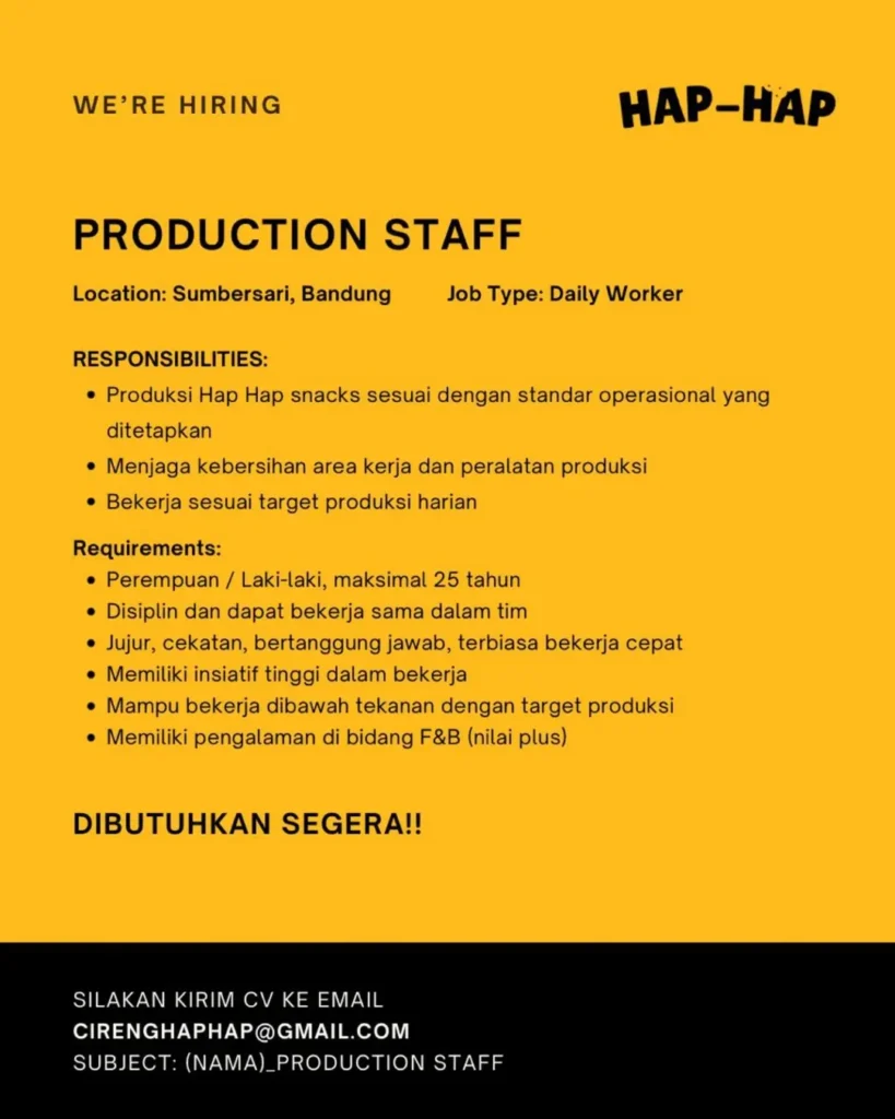 Dengan posisi sebagai Staff Produksi, loker Cireng Hap Hap Bandung harus dimanfaatkan sebaik mungkin.