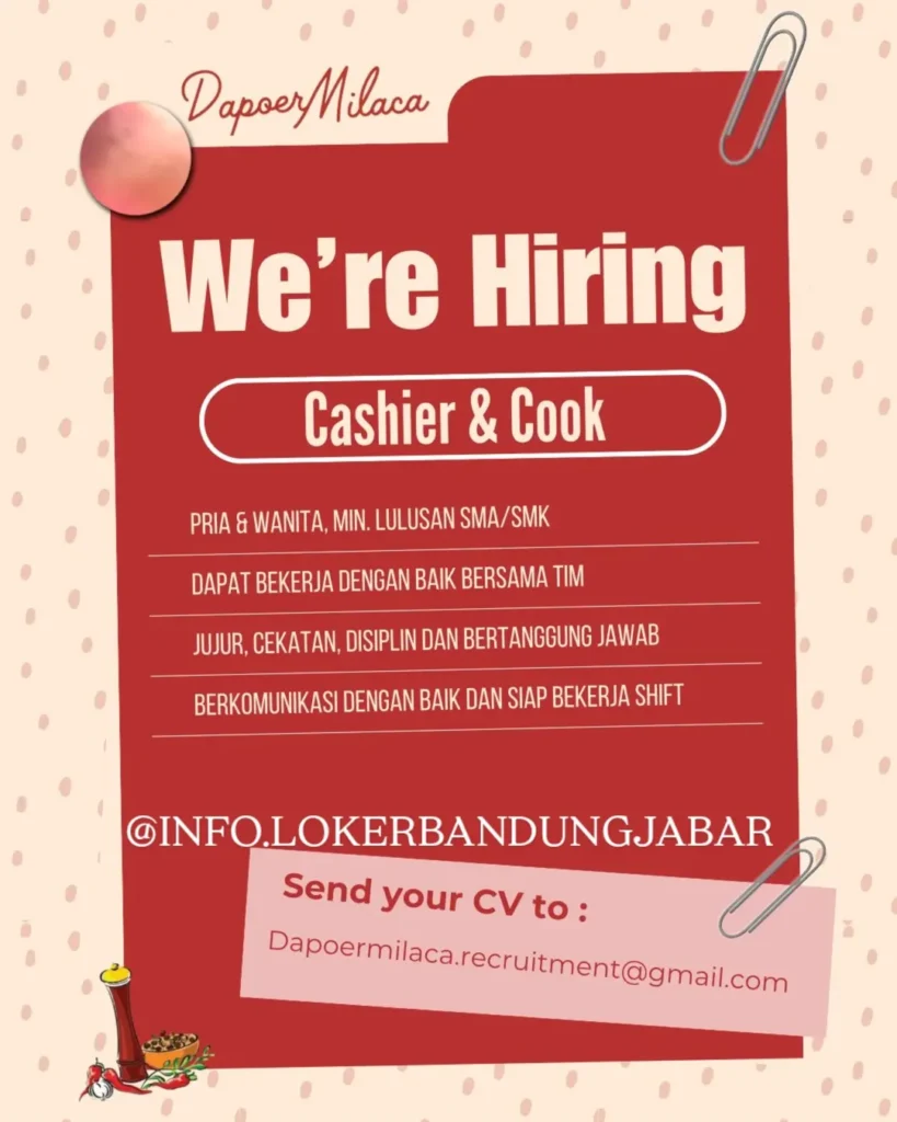Dengan posisi sebagai Cashier and Cook, loker Dapoer Milaca Bandung menjadi peluang emas bagi lulusan SMA/SMK.
