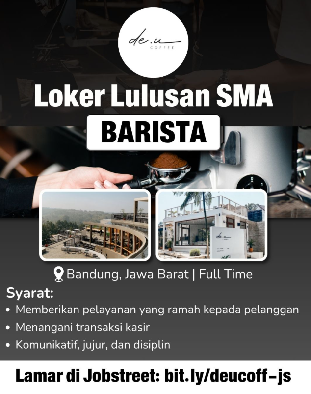 Pada saat ini, De.U Coffee Bandung tengah membuka lowongan kerja (loker) untuk umum.