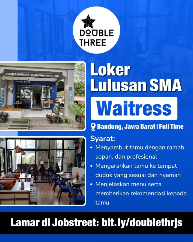 Pada saat ini, Double Three Cafe Bandung sedang membuka lowongan kerja (loker) yang terbuka bagi tamatan SMA dan SMK.