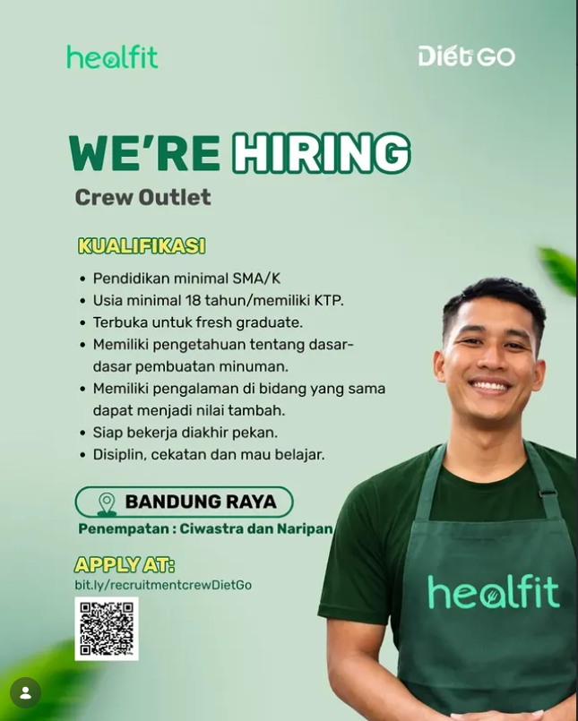 Untuk itu, Healfit dan Diet GO Bandung tengah menggelar lowongan kerja (loker) yang terbuka bagi tamatan SMA dan SMK tanpa pengalaman.