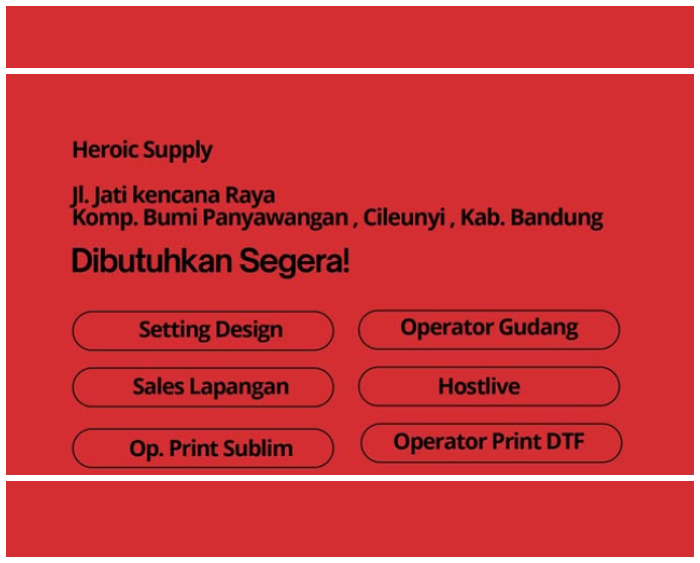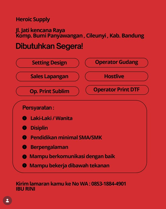 Sekarang, Heroic Supply Bandung membuka lowongan kerja (loker) besar-besaran dengan enam posisi sekaligus.