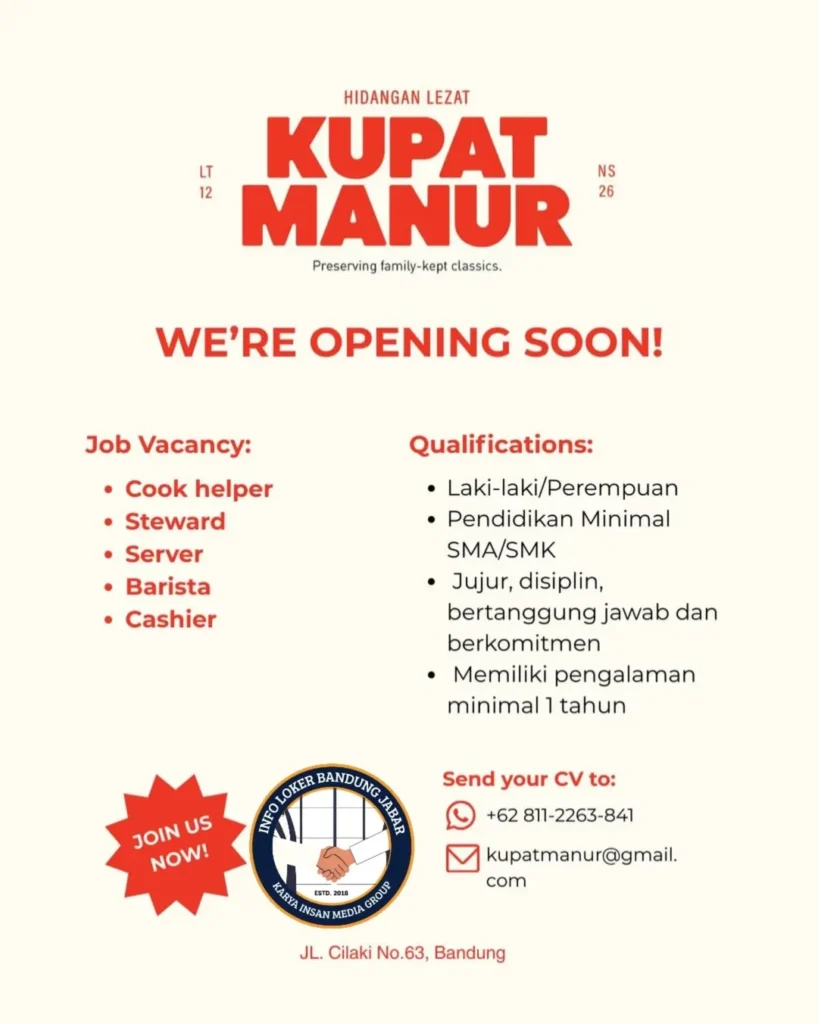 Sekarang, Kupat Manur Bandung tengah membuka lowongan kerja (loker) yang terbuka bagi tamatan SMA dan SMK.