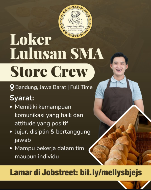 Dengan posisi sebagai Store Crew, loker Mellys Bakery Bandung menjadi suatu peluang yang tidak boleh dilewatkan.