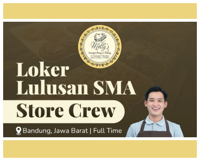Dengan posisi sebagai Store Crew, loker Mellys Bakery Bandung menjadi suatu peluang yang tidak boleh dilewatkan.