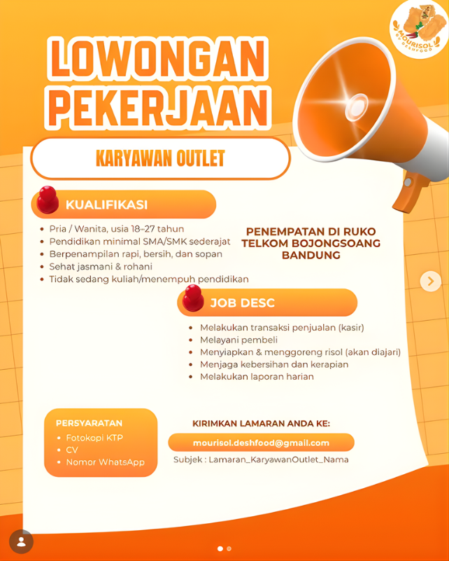 Dengan posisi sebagai Karyawan Outlet, loker Mourisol Risoles Premium Bandung bisa dicoba oleh lulusan SMA/SMK.