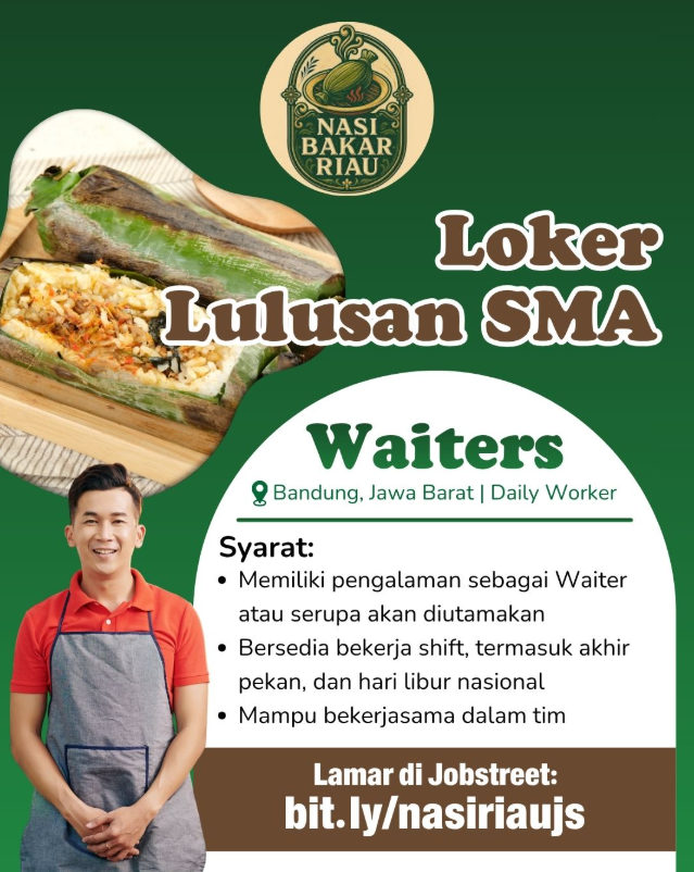 Dengan posisi sebagai Waiter, loker Nasi Bakar Riau Bandung menjadi peluang emas yang tidak boleh dilewatkan.