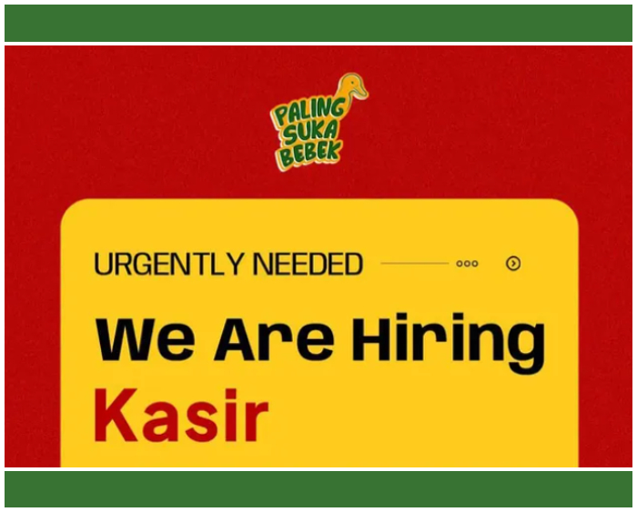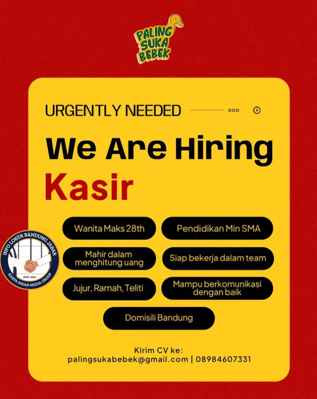 Dengan posisi sebagai Kasir, loker Paling Suka Bebek Bandung menjadi kesempatan emas bagi para lulusan SMA dan SMK.