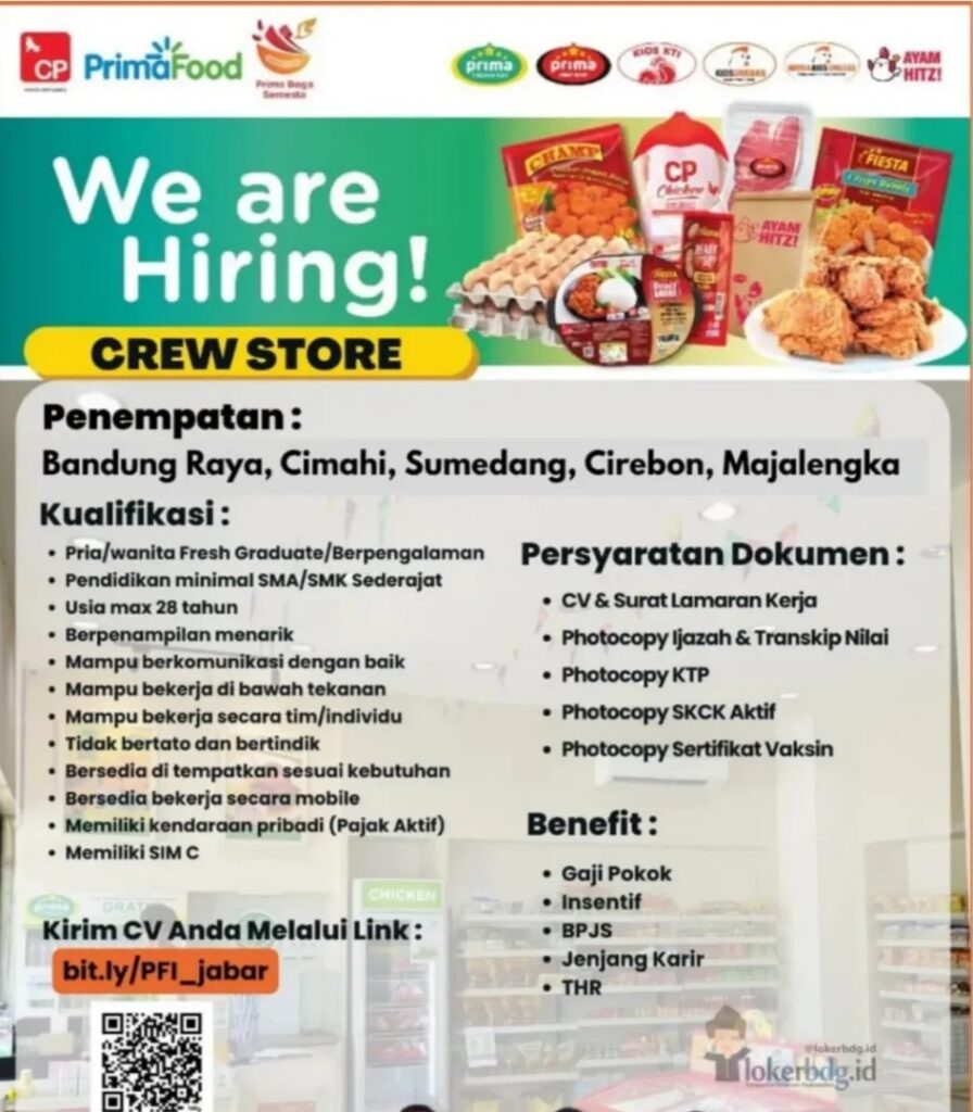 Dengan penempatan di Bandung, Cimahi, dan daerah sekitarnya, loker Prima Food menjadi kesempatan emas bagi lulusan SMA/SMK.
