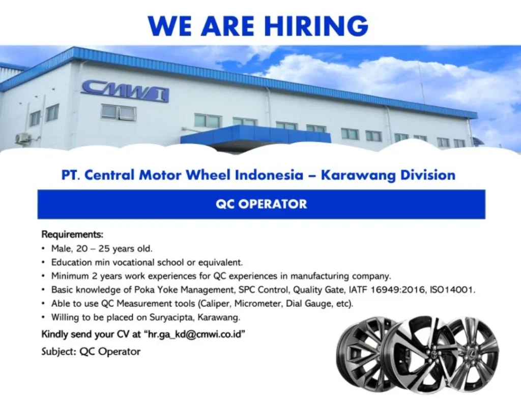 Dengan posisi sebagai QC, loker PT Central Motor Wheels harus dimanfaatkan oleh lulusan SMA/SMK.