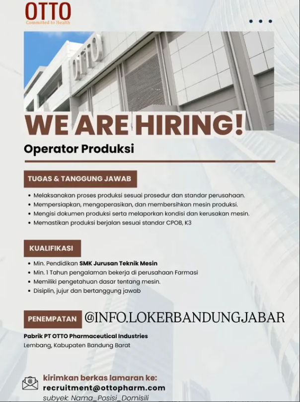 Dengan posisi sebagai Operator Produksi, loker PT OTTO Pharmaceutical Bandung menjadi peluang emas bagi lulusan SMA/SMK.