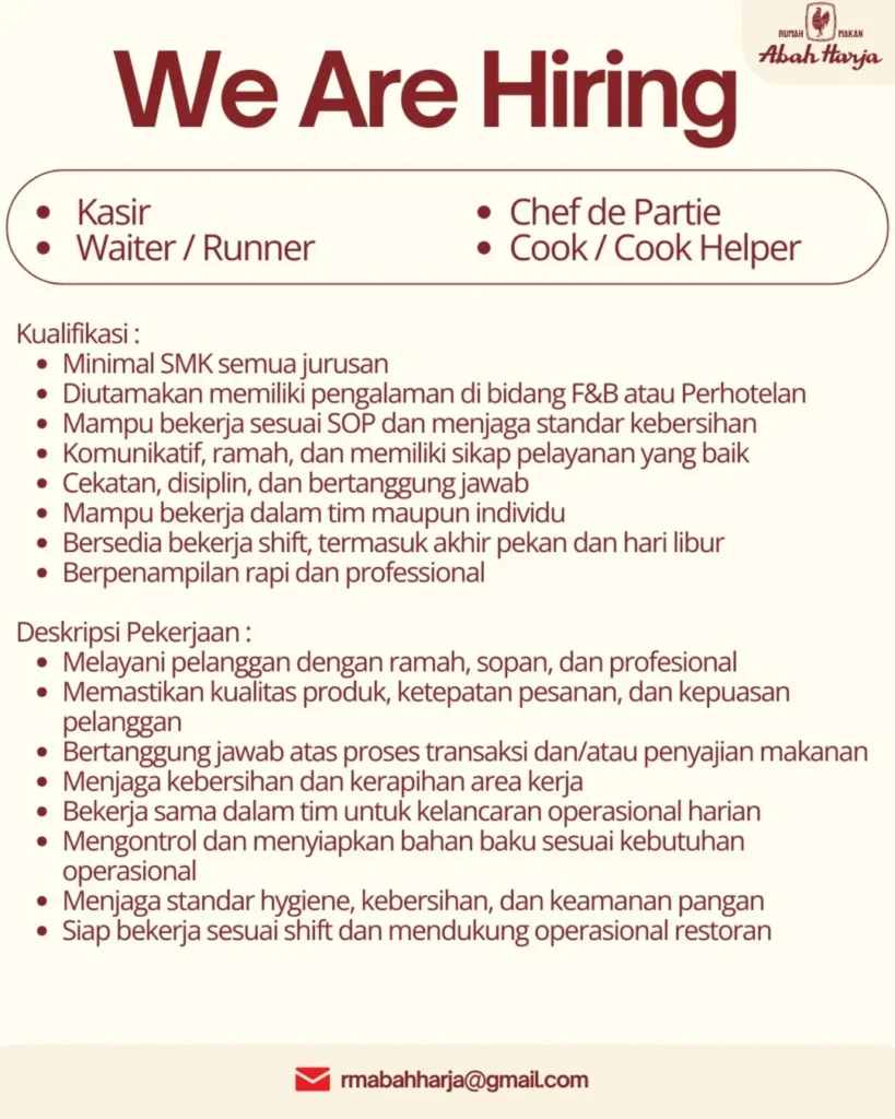 Dengan empat posisi sekaligus, loker Rumah Makan Abah Harja Bandung menjadi peluang yang tidak boleh dilewatkan.