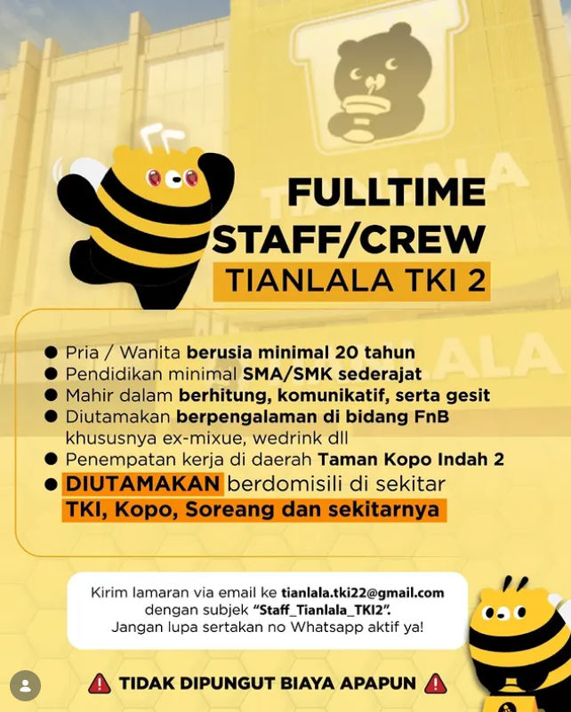 Dengan posisi sebagai Staff/Crew, loker Tianlala TKI 2 Bandung menjadi peluang emas yang tidak boleh dilewatkan begitu saja.