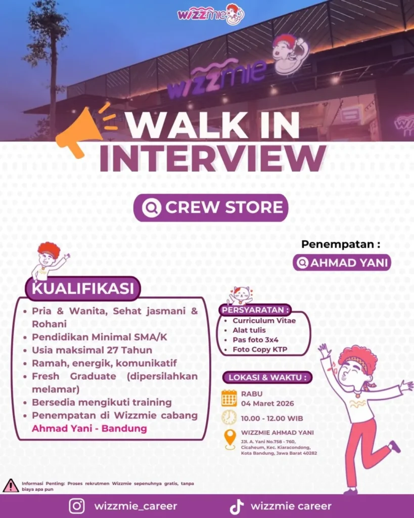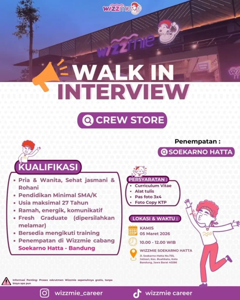 Saat ini, Wizzmie Bandung akan membuka lowongan kerja (loker) walk in interview yang terbuka untuk tamatan SMA dan SMK.
