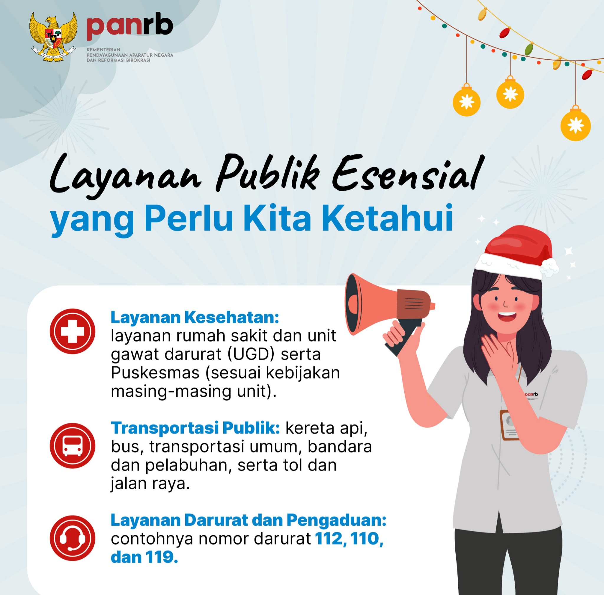 Adapun layanan esensial yang dimaksud adalah layanan kesehatan, transportasi, keamanan, dan lainnya. “Dalam rangka menjamin terselenggaranya pelayanan publik terutama untuk pelayanan publik yang esensial selama masa Libur Nasional dan Cuti Bersama, diperlukan koordinasi untuk memastikan keselarasan dalam pelaksanaan operasional pelayanan publik,” tulis SE Menteri PANRB.