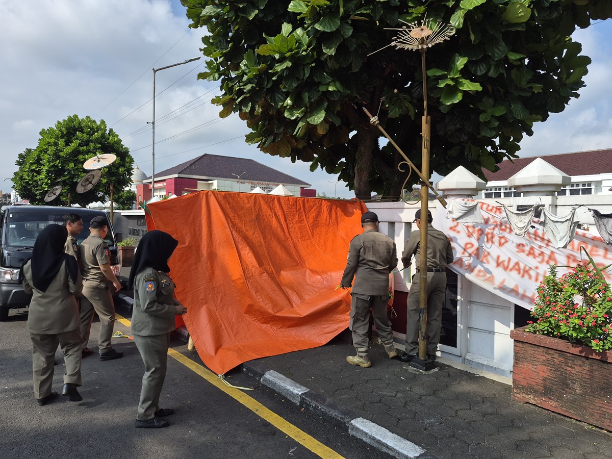 Dua minggu dibiarkan, tapi tenda malah bermutasi jadi “pemukiman non-permanen”. Fungsi kantor pemerintah terganggu. Yang bikin geram: jemuran pakaian, termasuk celana dalam, terpampang di pagar dan taman Balekota.