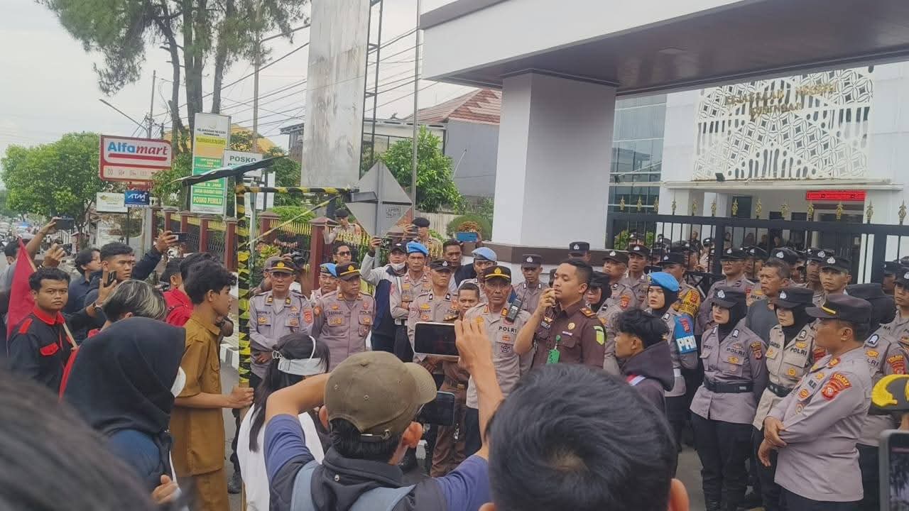 Kasi Intelijen Kejari Kuningan, Brian Kukuh Mediarto didampingi Kapolres Kuningan AKBP Muhamad Ali Akbar, menemui aksi massa di depan pintu gerbang Kantor.