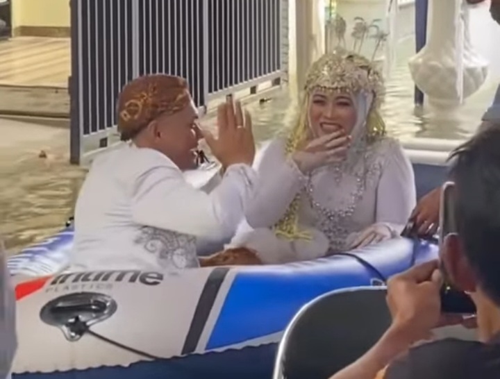 Dalam video pernikahan di atas genangan air yang tersebar di medsos, memperlihatkan bagaimana suasana pernikahan yang tetap digelar meski area sekitar tergenang banjir dan pasangan pengantin ini tetap ceria.