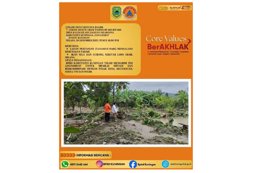 “Banjir juga terjadi di Desa Kalimati, Kec. Jalaksana, akibat sungai meluap akibat pendangkalan,” ujar Kalak BPBD Indra Bayu Permana Kamis (01/01/2026).