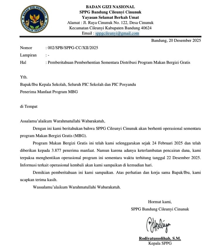 Pengumuman pemberhentian operasional MBG dari SPPG Bandung-Cileunyi-Cinunuk ini suratnya diterima oleh sejumlah pengelola sekolah dan kader Posyandu. Program MBG ke Posyandu sasarannya adalah ibu hamil (bumil), ibu menyesui (busui) dan balita.