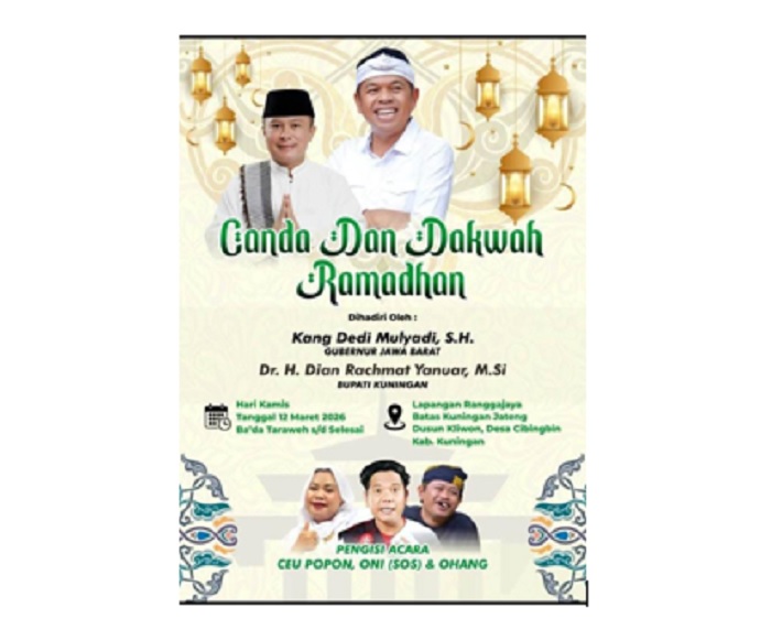 TERASJABAR.ID – Gubernur Jawa Barat Kang Dedi Mulyadi (KDM) bersama Ceu Popon, Oni (SOS) dan Ohang memastikan akan menghibur warga Kuningan dan sekitarnya dalam acara “Canda dan Dakwah Ramadan” yang digelar di Lapangan Ranggajaya, Desa/Kecamatan Cibingbin, perbatasan Kuningan-Jawa Tengah), Kamis 12 Maret 2026, bada salat tarawih Pukul 20.30 WIB.