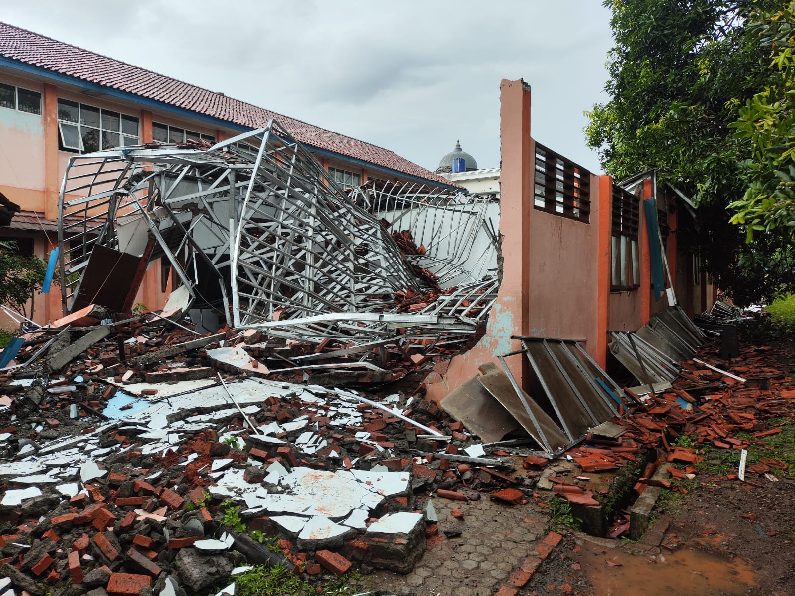 Salah seorang siswa yang merekam kejadian ini mengatakan, bangunan tiba-tiba roboh saat hujan deras mengguyurdisertai angin kencang.
