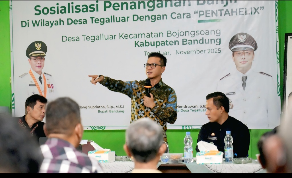 Keseriusan dan komitmen Bupati yang akrab disapa Kang DS tersebut dibuktikan dengan menggelar kegiatan Sosialisasi Penanganan Banjir wilayah Sapan Tegalluar dengan cara Pentahelix di Kantor Desa Tegalluar, Kamis (27/11/2025).