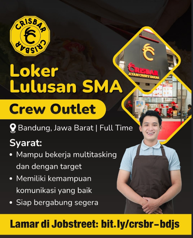Sekarang, Ayam Crisbar Bandung sedang membuka lowongan kerja (loker) yang terbuka bagi tamatan SMA dan SMK.