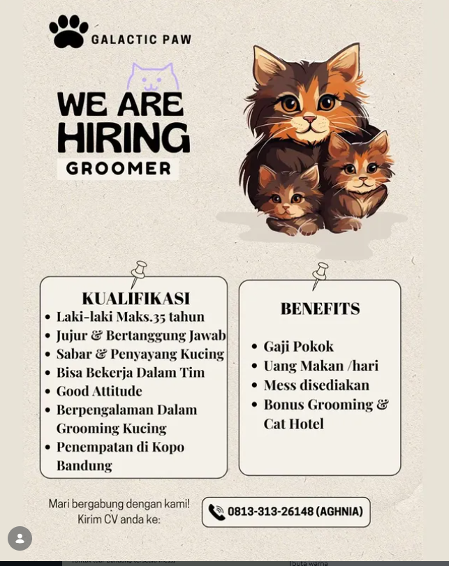 Sekarang, Galactic Paw Kopo Bandung sedang menggelar lowongan kerja (loker) bagi semua orang.