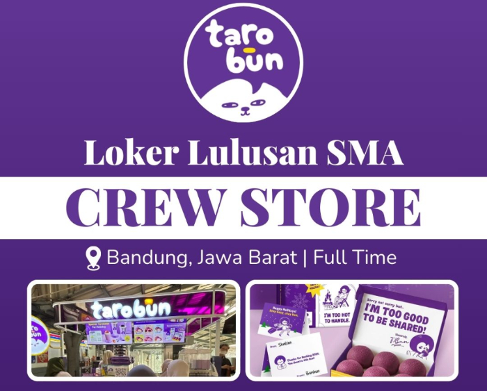 Pasalnya, saat ini Taro Bun Bakery Purwakarta sedang membuka lowongan kerja (loker) yang terbuka bagi tamatan SMA dan SMK.