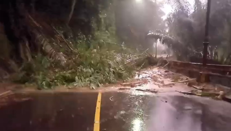 Dalam video tersebut terlihat longsoran menutup badan jalan sehingga jalan tertutup total karena material longsor menggusur pohon aren dan bambu.
