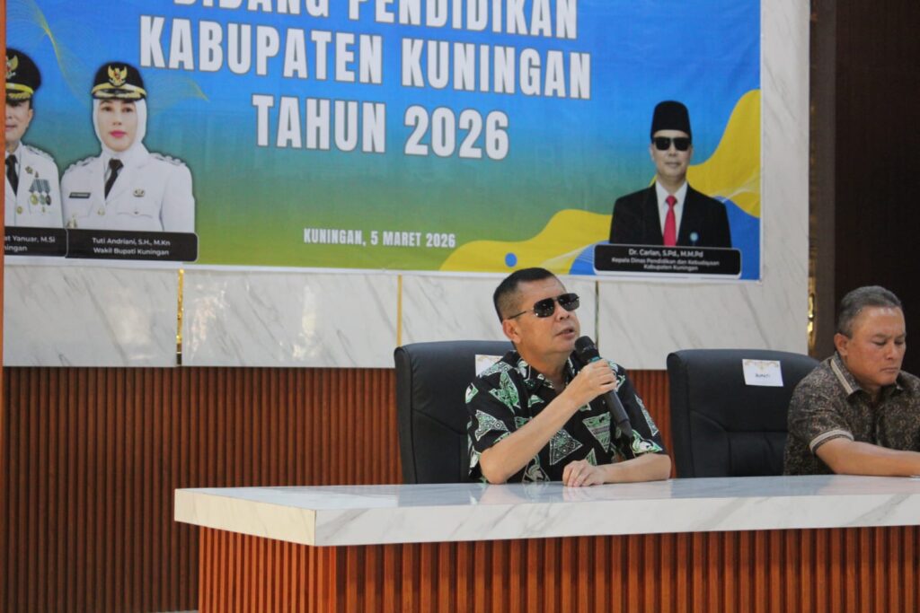 Demikian dikatakan Kepala Dinas Pendidikan dan Kebudayaan Kuningan Dr. Carlan, S.Pd, M.M.Pd., dihadapan peserta Rapat Koordinasi Bidang Pendidikan, yang dihadiri Bupati Dian Rachmat Yanuar, Sekdis H.Pipin Arifin, para Camat, Kepala desa/Lurah dan para Kabid Disdikbud Kuningan, di Bale Waluya SLBN Taruna Mandiri, Desa Sampora, Cilimus, Kamis (05/03/2026).