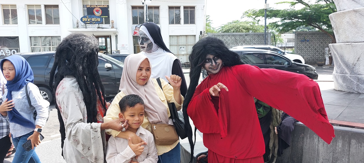 Ujang (32) seorang anggota Comjurig Bandung di sela keramaian pengunjung menuturkan, “Awalnya kami bareng sejumlah teman iseng untuk mengenakan kostum hantu atau makhluk menyeramkan. Lalu beraktivitas di sekitar jalan Asia Afrika Kota Bandung. Komunitas cosplayer ini tidak semua berdandan seperti hantu, tetapi ada juga robot, trasformer atau anime.”