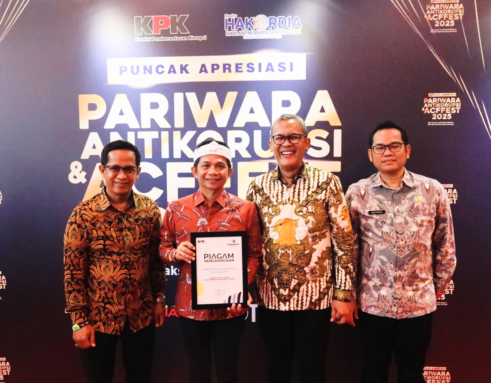 Bupati Purwakarta Saepul Bahri Binzein, didampingi Kadiskominfo Hendra Fadly dan Plt. Inspektur Inspektorat Purwakarta Yayat Hidayat, hadir untuk menerima penghargaan tersebut dari KPK RI.